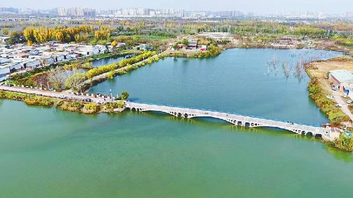 11月27日,记者沿乡间小径行至市经开区王快镇百泉社区、北厂社区交界处,记者看到在阳光照耀下,百泉湖面泛起点点波光。湖畔芦花如浪,随风而荡。周边民居挨挨挤挤,铺陈开去。这里俨然一片世外桃源。“这是我们家门口的百泉湖。”家住百泉社区的古稀老人魏安芹说。