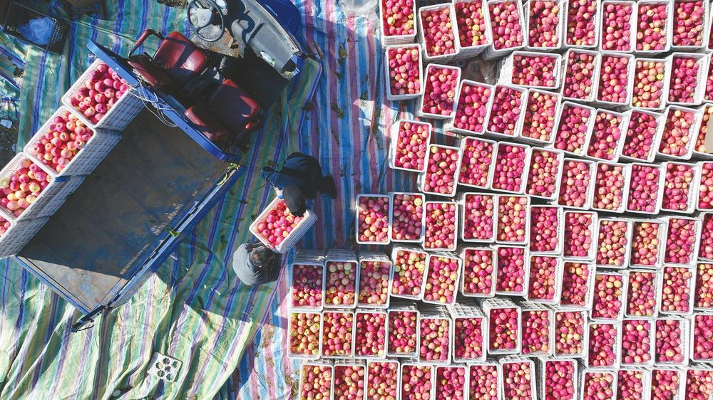 10月27日,在信都区浆水镇坡子峪村山场上,果农正在将刚采收的苹果集中分拣销售。
