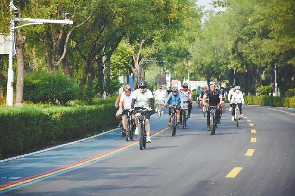 随着“泉城骑行”运动品牌的影响力不断扩大,越来越多的市民加入骑行队伍,感受骑行魅力。图为8月2日,我市骑行爱好者在七里河北岸健身绿道开展骑行活动。本报记者 黄涛摄