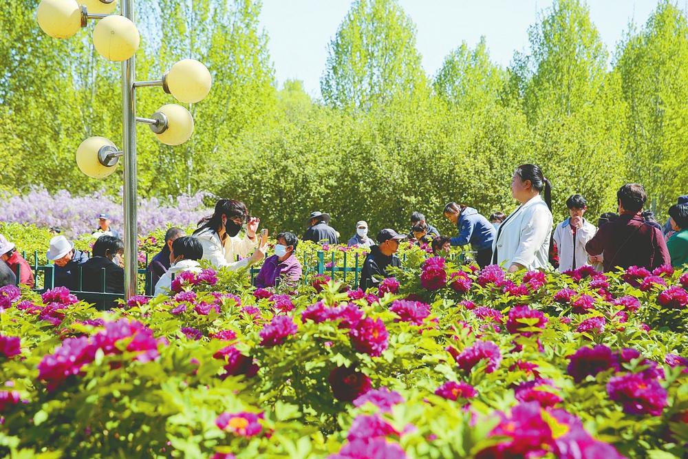 本报讯近日,达活泉公园牡丹园内3万余株牡丹竞相绽放,层层叠叠的花瓣如云似锦,吸引众多市民踏春赏花,尽享“国色天香”的春日盛宴。