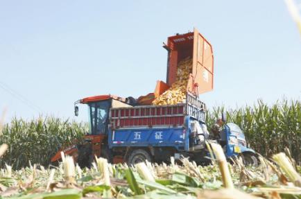 10月14日,在南和区阎里乡金沙河农作物种植专业合作社的基地里,农民驾驶收割机抢收玉米。目前,我市各地农民抢抓晴好天气开展秋粮抢收。 韩文洲、冀云飞摄