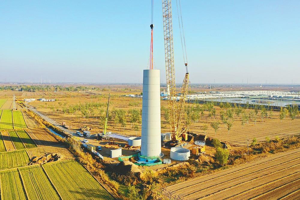 11月13日,在新河县风电项目施工现场,工人在安装风机塔筒。