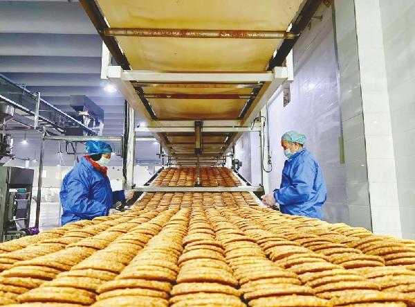 在宁晋县河渠镇一家食品企业内,工人正在饼干生产线上作业。胡盼玲摄
