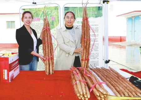 ③ 9月23日,在柏乡县庆祝“中国农民丰收节”活动现场,农民展示收获的麻山药。黄涛、王光耀摄