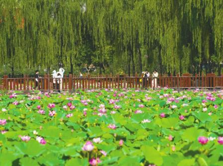 近日,在襄都区红星街一处游园内,荷花竞相开放,娇艳迷人,吸引市民和游客前来赏荷拍照。