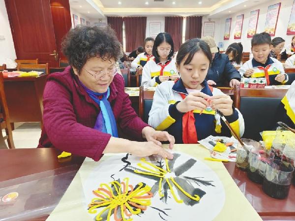 近日,襄都区北大街街道牛市新街社区联合马路街小学开展以“岁岁重阳暖 浓浓敬老情”为主题的重阳敬老活动。孩子们与社区的老人们围坐在一起,共同完成“重阳赏菊”绘画手工作品。 张志霞摄