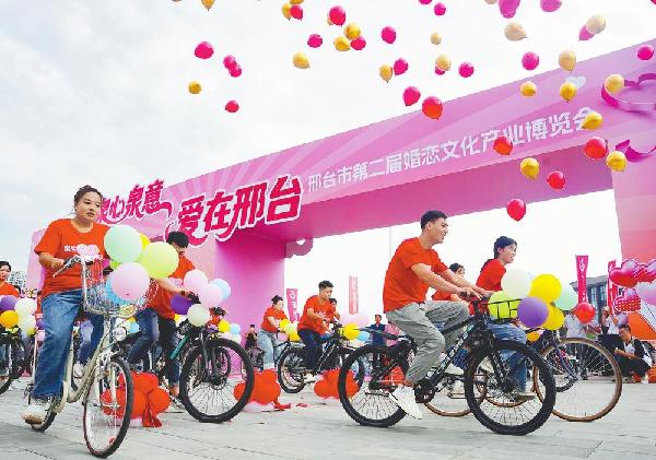 8月29日,市第二届婚恋文化产业博览会在京南后海广场浪漫启幕。图为活动现场参加集体婚礼的18对新人和新时代红娘代表开启浪漫的自行车婚礼骑行之旅。本报记者 韩文洲摄